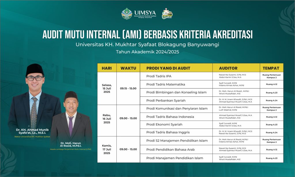 Blokagung – Dalam upaya muntuk memastikan bahwa sistem manajemen mutu yang diterapkan telah efektif dan sesuai dengan standar yang ditetapkan, serta mengidentifikasi peluang perbaikan. Lembaga Penjamin Mutu Internal (LPMI) Universitas KH. Mukhtar Syafaat (UIMSYA) Blokagung Banyuwangi menggelar Audit Mutu Internal (AMI) Tahun 2025. Kegiatan ini berlangsung selama tiga hari, (15-17/7/2025), bertempat di ruang pertemuan Kampus […]