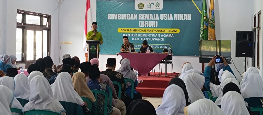 Banyuwangi — Fakultas Dakwah dan Komunikasi Islam (FDKI) Universitas KH. Mukhtar Syafaat (UIMSYA) Blokagung Banyuwangi bersama Kantor Kementerian Agama Kabupaten Banyuwangi menggelar Bimbingan Remaja Usia Nikah (BRUN) yang diikuti oleh ratusan mahasiswa. Kegiatan ini menjadi penting karena tidak hanya memberikan wawasan, tetapi juga membangun pola pikir yang matang sebelum memasuki fase pernikahan, Pada Kamis (27/11/2025).