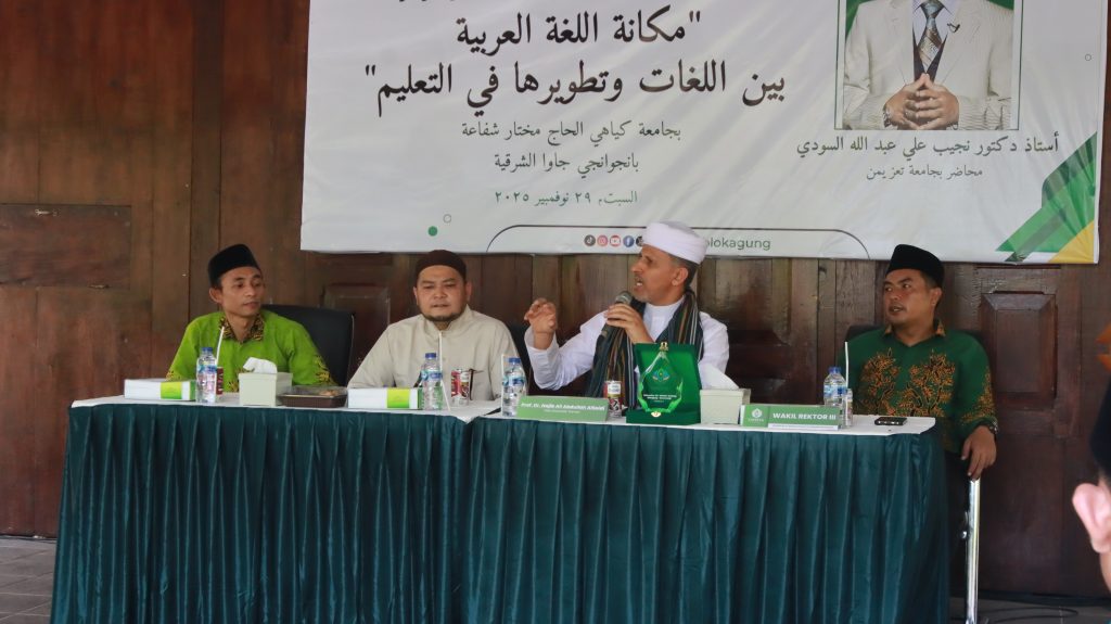 Sebagai narasumber utama, hadir Prof. Dr. Najib Ali Abdullah AlSoidi dari Taiz University, Yaman, seorang akademisi internasional yang dikenal aktif dalam kajian linguistik Arab dan pengembangan kurikulum bahasa. Dalam pemaparannya, ia menjelaskan bahwa bahasa Arab bukan hanya bahasa agama, namun juga bahasa ilmu pengetahuan, diplomasi, dan komunikasi global yang terus berkembang. Posisi strategis bahasa Arab semakin kuat seiring meningkatnya publikasi ilmiah, kerja sama internasional, serta kebutuhan dunia terhadap kajian Islam moderat yang bersumber dari literatur berbahasa Arab.