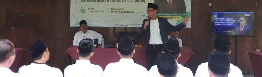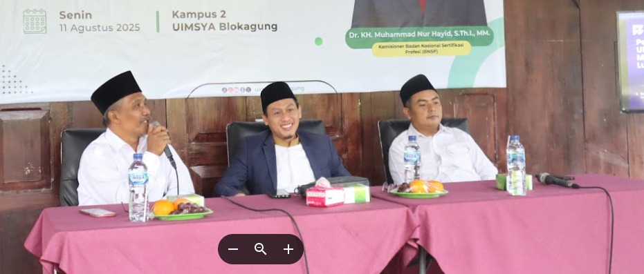 Blokagung, Banyuwangi – Dr. KH. Muhammad Nur Hayid, S.Th.I., M.M., Komisioner Badan Nasional Sertifikasi Profesi (BNSP), menjadi narasumber utama dalam Seminar Nasional bertema “Penguatan Lulusan UIMSYA di Pasar Kerja melalui Sertifikat Kompetensi” di Universitas KH. Mukhtar Syafaat (UIMSYA) Blokagung, Banyuwangi, Senin (11/8/2025).