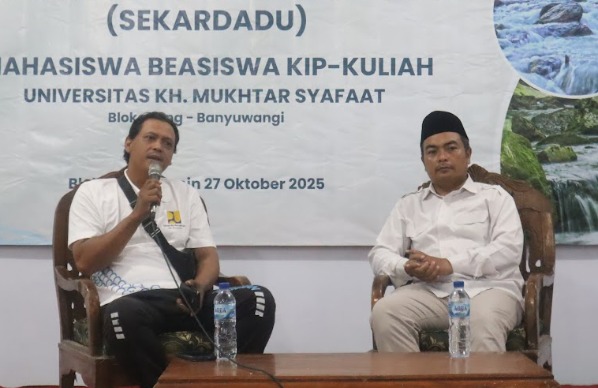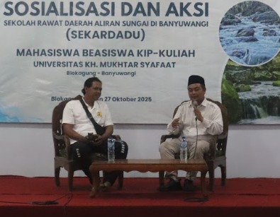 Banyuwangi — Universitas KH. Mukhtar Syafaat (UIMSYA) Blokagung Banyuwangi bekerja sama dengan Koordinator Sumber Daya (Korsda) Bangorejo menggelar kegiatan Sosialisasi dan Aksi Sekardadu pada Senin (27/10/2025). Kegiatan ini melibatkan mahasiswa penerima Beasiswa KIP-Kuliah UIMSYA dengan tujuan menumbuhkan kepedulian terhadap lingkungan dan meningkatkan kesadaran pengelolaan air bersih serta pengurangan sampah di masyarakat. Acara berlangsung di Desa Karangdoro, Dusun Blokagung, Kecamatan Tegalsari.
